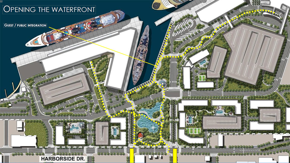 All cruise traffic will enter and exit on 23rd Street. Delivery trucks will continue to enter at 33rd Street for supply deliveries.